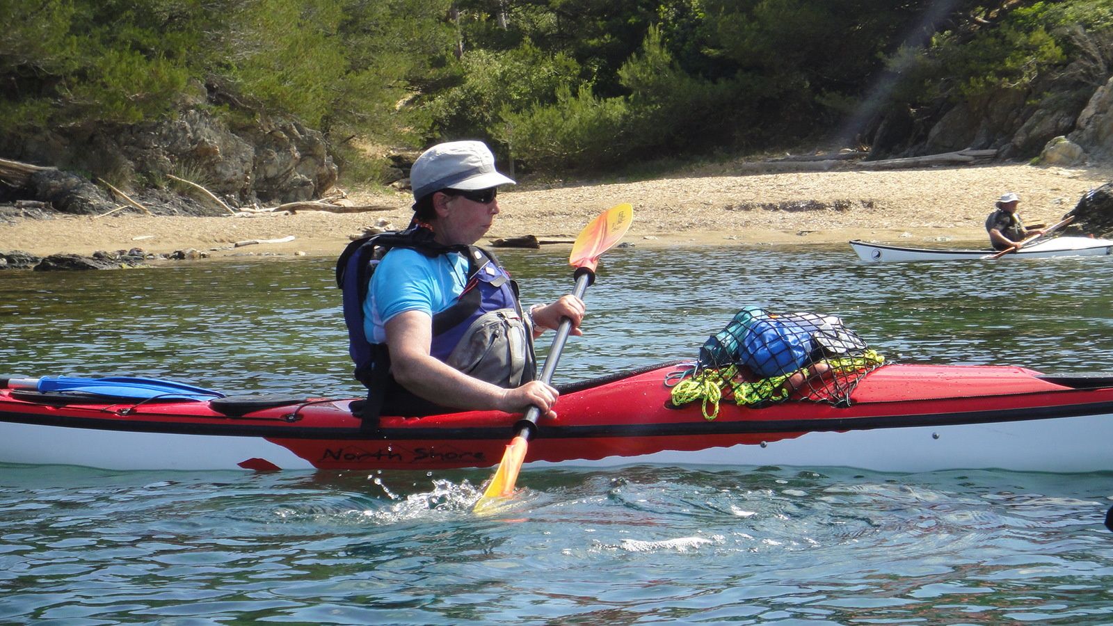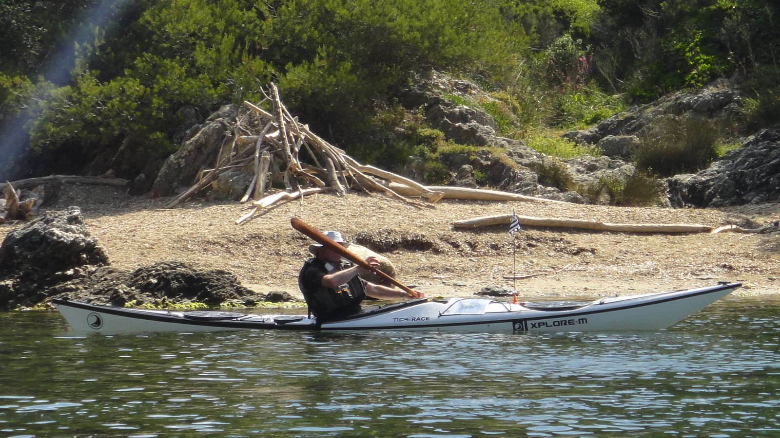 Jean-Yves tente une expérience de pagayage avec une perche de bambou.