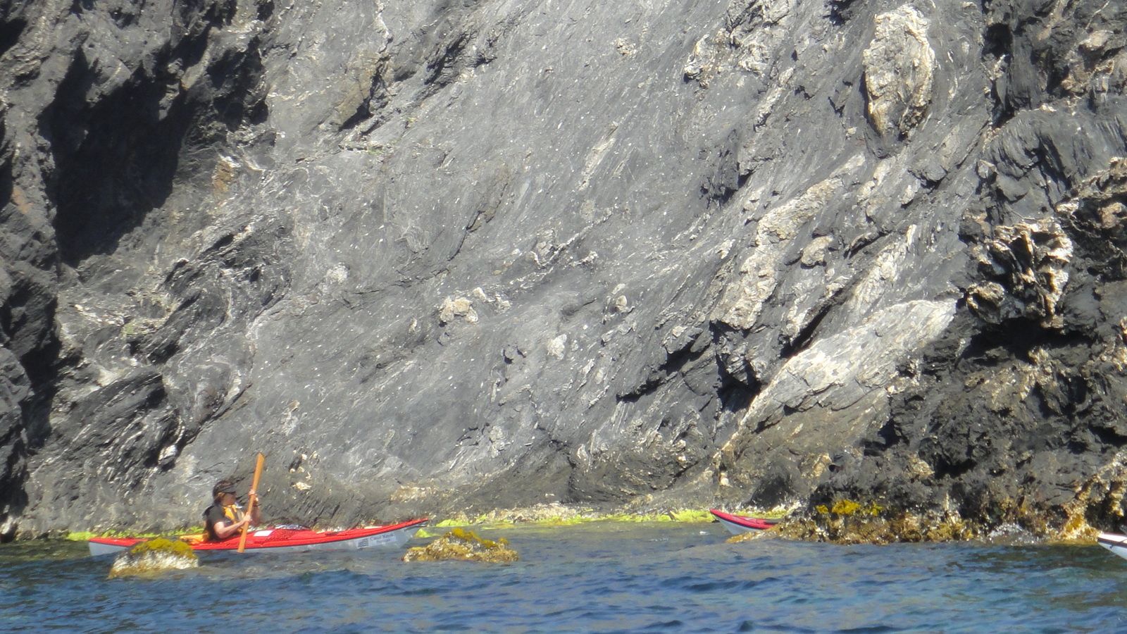 Les roches sombres très découpées contrastent avec l'eau turquoise.